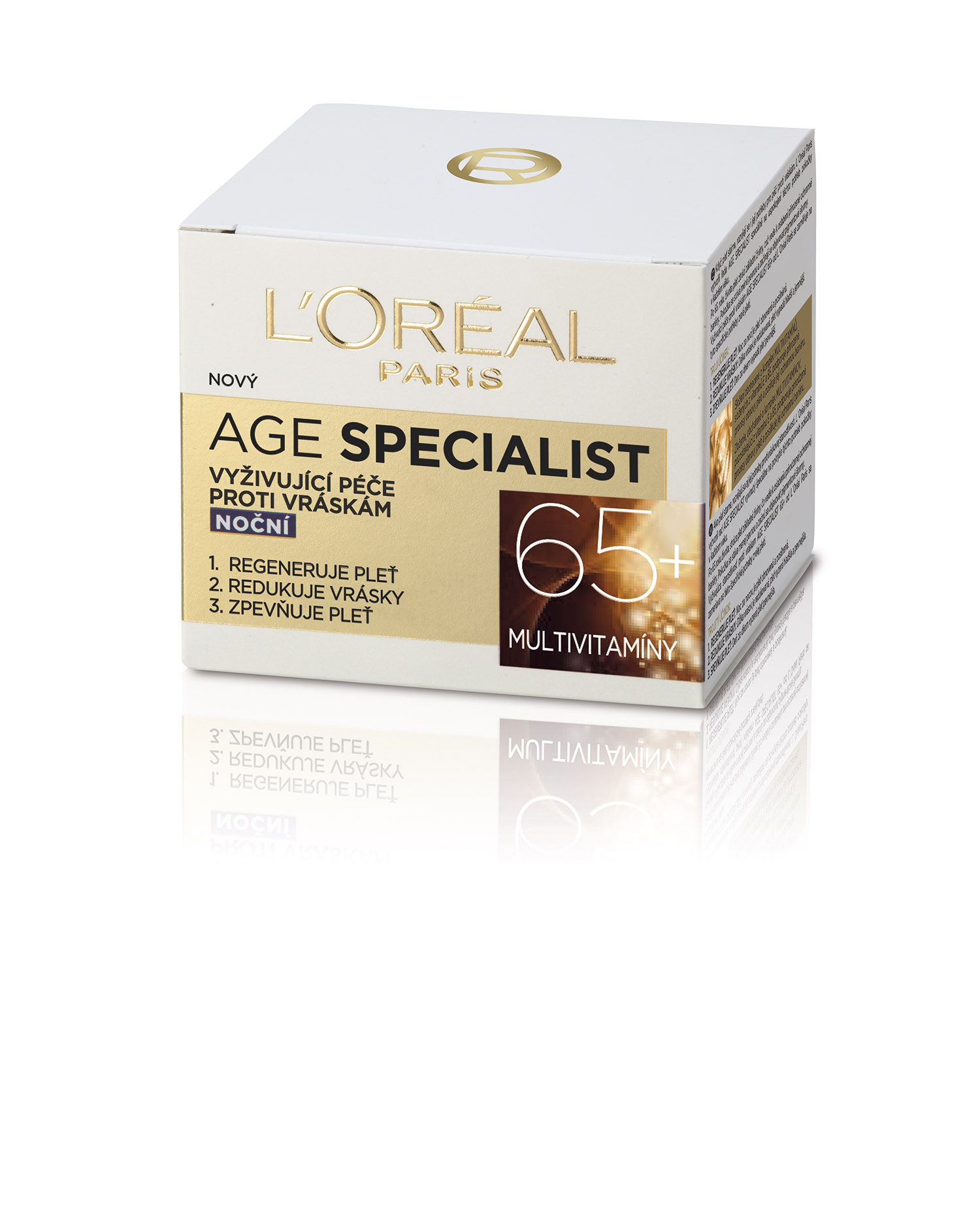 A bőrnek különleges ránctalanító igényei vannak a kor előrehaladtával. A L'Oréal Paris megalkotta az Age Specialistot, egy termékcsaládot, mely minden korcsoport számára megfelelő ránctalanító ápolást nyújt. 65 év felett, a bőr veszíthet tápláltságából, feszességéből és foltok jelenhetnek meg rajta. Az Age Specialist ránctalanító tápláló ápoló 65+ az érett bőrnek kíván célzott ápolást nyújtani. Hármas hatás: 1. Segít feszesíteni a bőrt: Éjszakáról éjszakára a bőr revitalizálódik. 2. Segít csökkenteni a ráncok láthatóságát: A bőr puhábbnak és simábbnak érződhet. 3. Segít halványítani a foltokat: Napról napra a bőr erősebb lehet. E- és B5-vitaminból álló multivitaminos hatóanyag kombinációval gazdagított összetétele elősegíti a bőr természetes ápolását és védőrétegének megerősítését.
