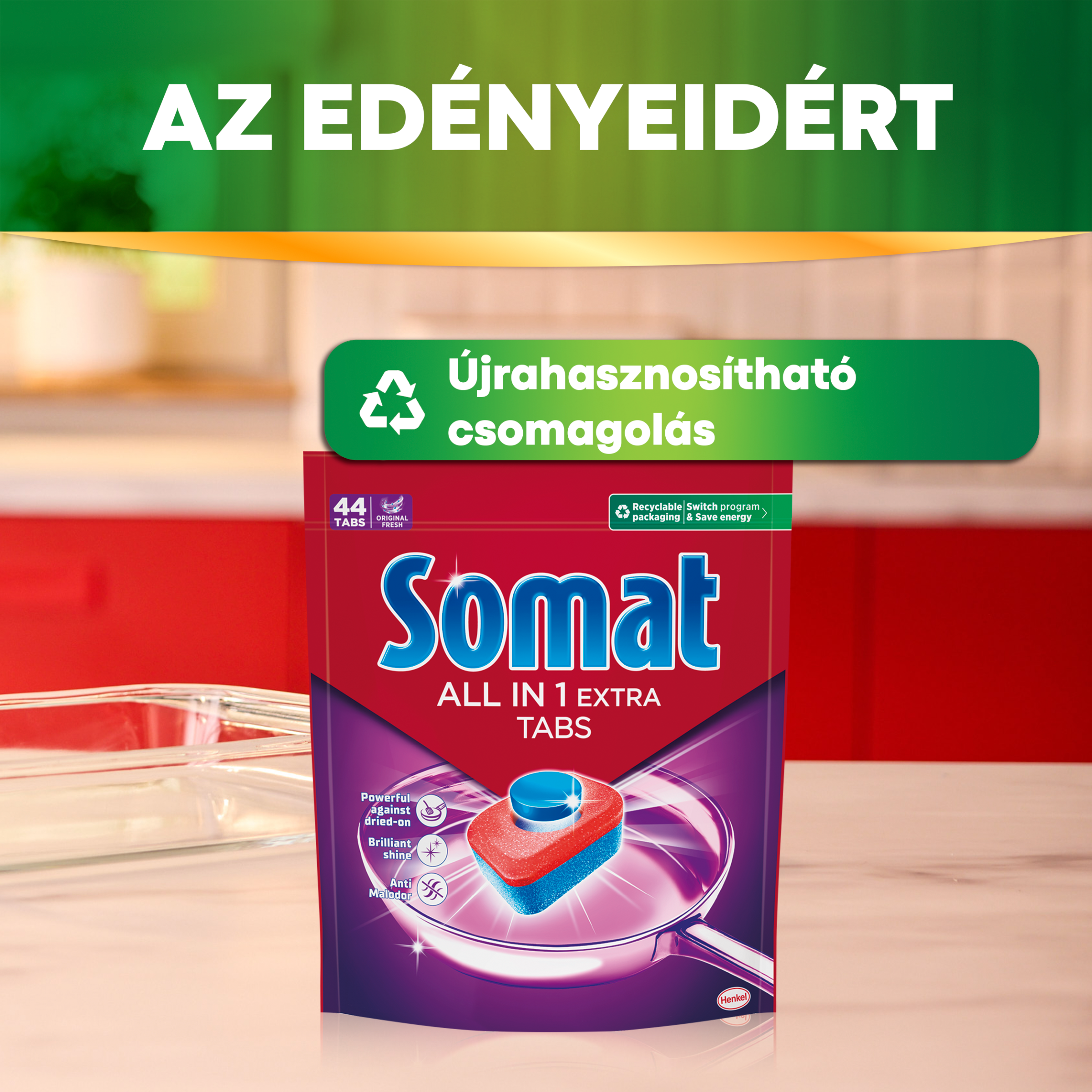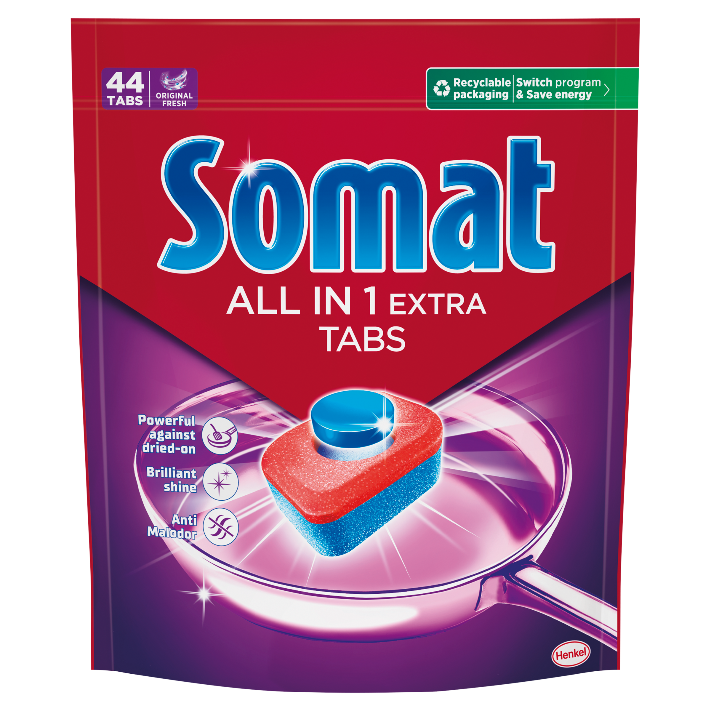 Somat All in 1 Extra: A tiszta edényekért és az odaégett szennyeződések ellen - még alacsony hőmérsékletű Eco vagy alacsony hőmérsékletű rövid mosogatási programok használata esetén is, miközben akár 20% energiát is megtakaríthat. A Somat All in 1 Extra tabletta vízben oldódó fóliában csomagolt, használatához nem szükséges kicsomagolni.