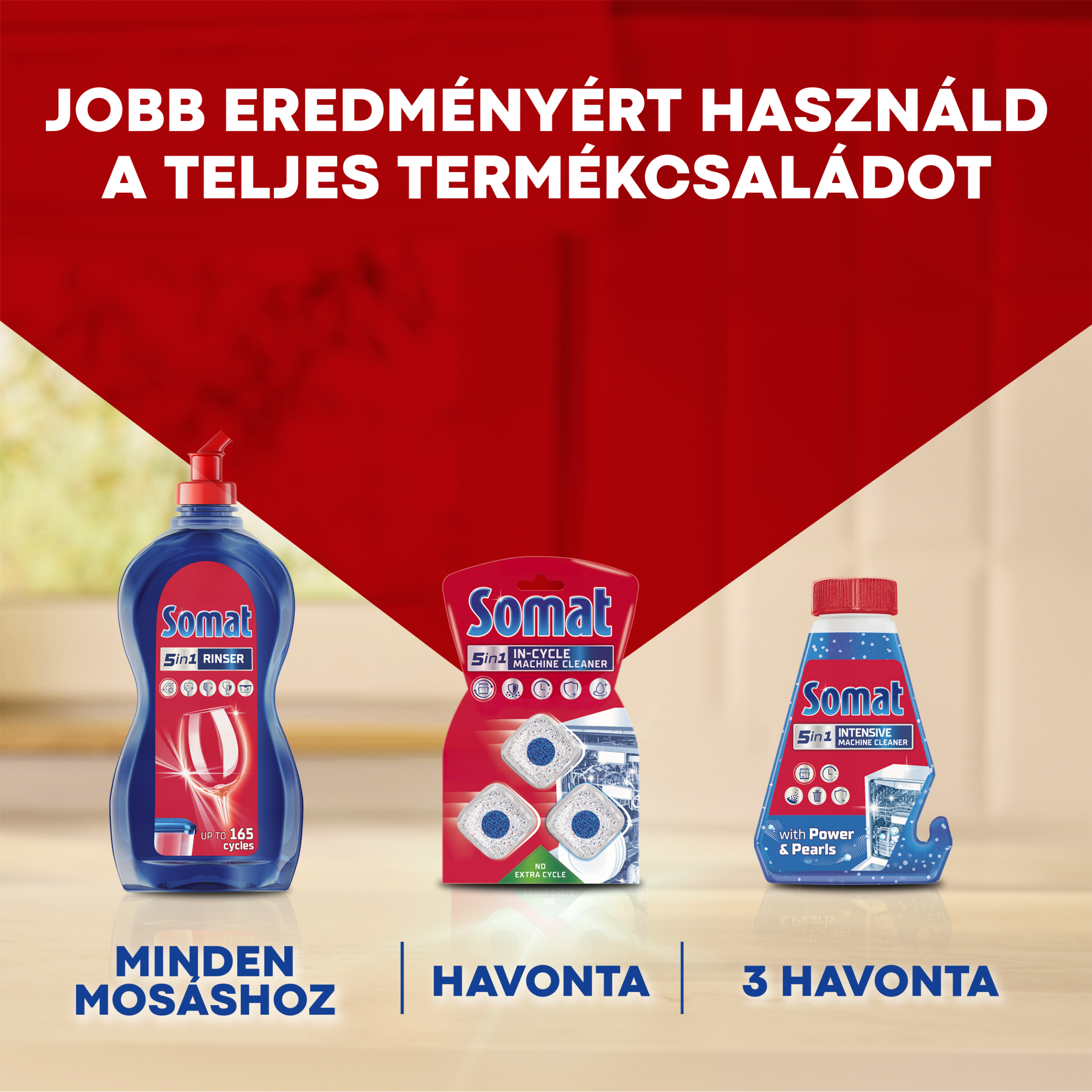 A Somat All in 1 Extra tabletta erőteljes tisztítóhatást biztosít még akkor is, ha világítanak a mosogatógép öblítőszer vagy a só kiürülését jelző lámpai. Mindkét esetben a mosogatógép öblítő és vízlágyító funkciói továbbra is működnek. Só és/vagy öblítőszer kiegészítő használata mindig lehetséges. Kemény víz esetén (>21° dH) használja a Somat All in 1 Extra tablettát a Somat Power sóval együtt. Vízkeménységgel kapcsolatban érdeklődjön a helyi vízszolgáltatónál.